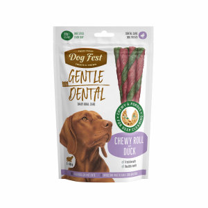 Dog Fest Poslastica Chewy Roll - Patka - je ukusna i funkcionalna dentalna poslastica namijenjena svakodnevnoj oralnoj njezi odraslih pasa. Dental Chewy Roll s patkom izrađena je od prirodnih sastojaka i posebno oblikovana tako da učinkovito čisti zube, osvježava dah i pomaže u održavanju zdravih desni.