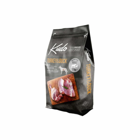Prirodna snaga u svakom obroku. KUDO Turkey & Duck Adult Medium & Maxi je potpuna i uravnotežena suha hrana namijenjena odraslim psima srednjih i velikih pasmina. Temelji se na 30 % dehidriranog mesa puretine i patke, uz dodatak batata, zobi i bundeve, a proizvedena je pomoću hladno prešane tehnologije koja čuva prirodnu nutritivnu vrijednost sastojaka.