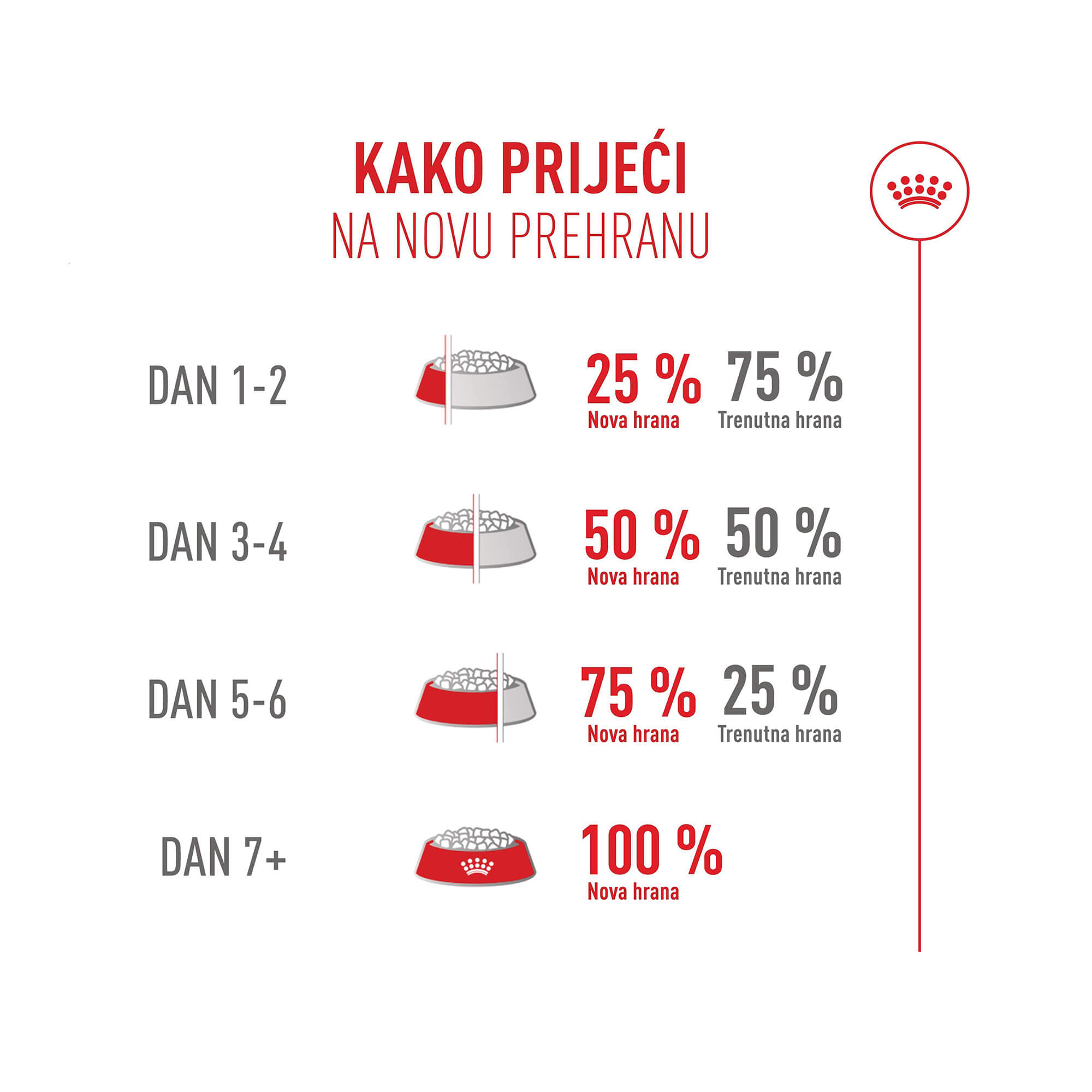 Mačku bi trebalo naviknuti na novu hranu neometano i postupno u razdoblju od sedam do deset dana. Slijedite upute za hranjenje na pakiranju kako biste osigurali ispravne porcije.