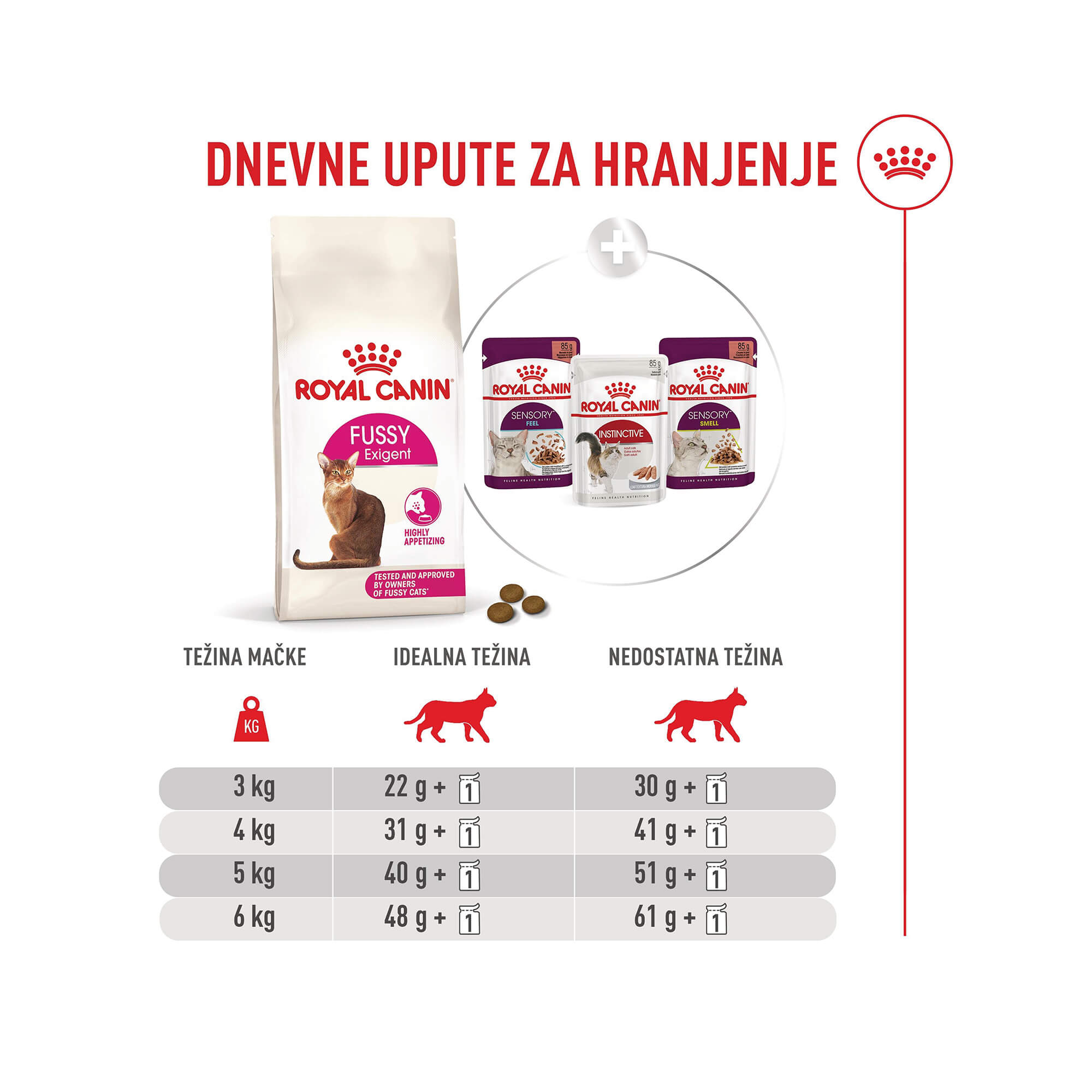 Za bolji okus i ugodnije iskustvo izbirljivih mačaka formula hrane Fussy kombinira tri prijašnje hrane linije Exigent (Savour, Aroma i Protein) u jedan ukusan proizvod: ROYAL CANIN® Fussy.