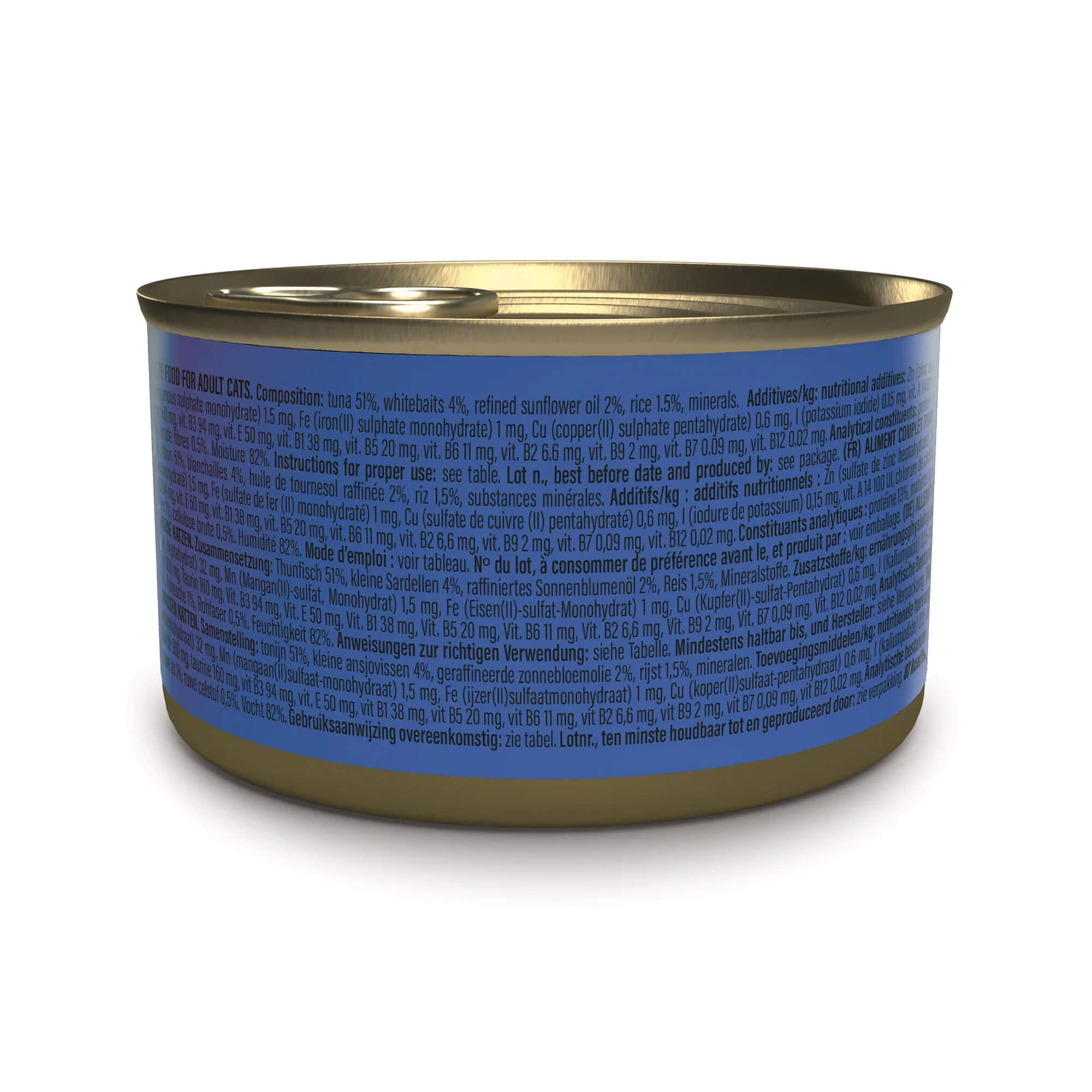 Sastav: tuna 51%, bijela riba (whitebaits) 4%, riža 1,5% rafinirano suncokretovo ulje 2%, minerali
